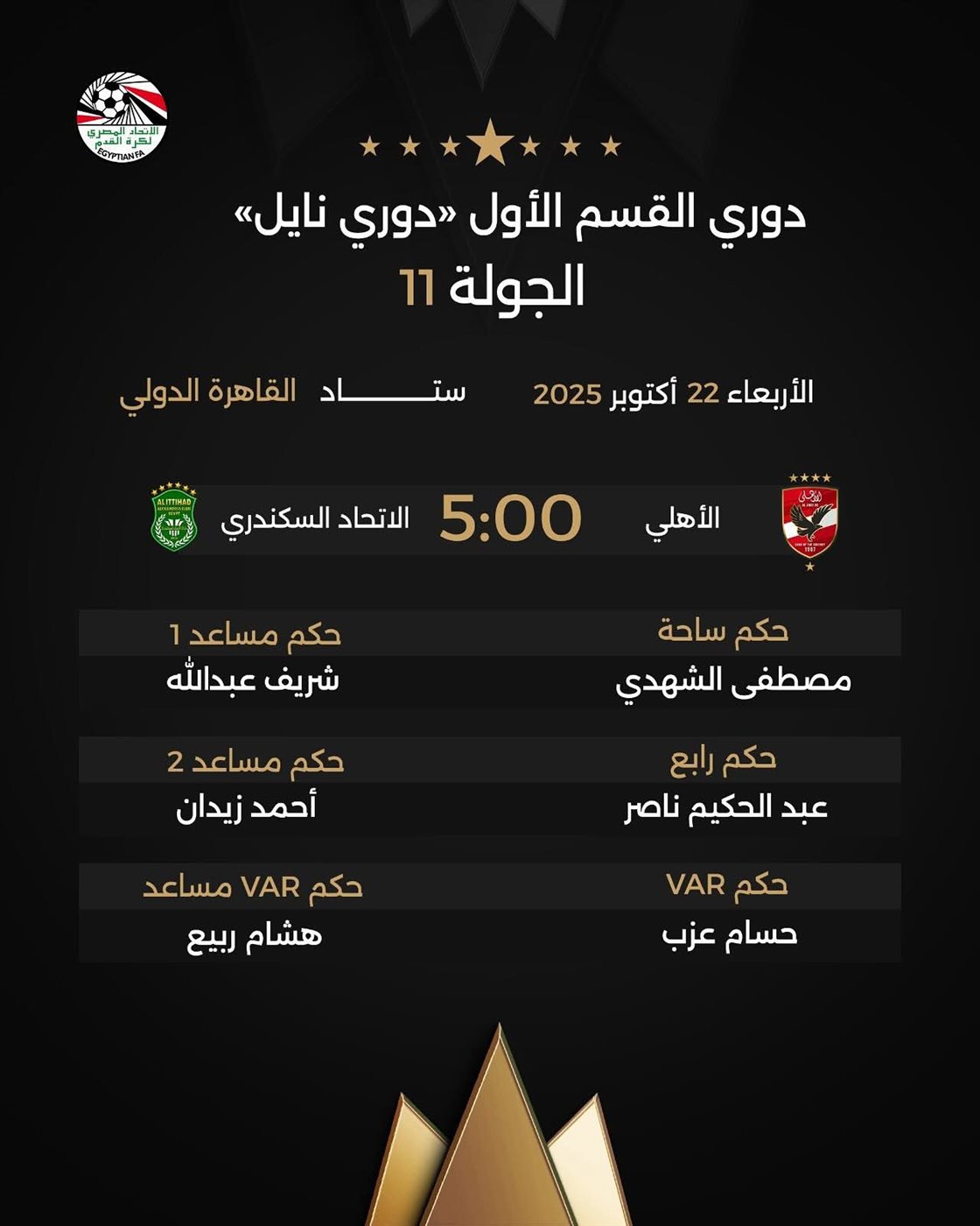 ويلتقي الأهلي في مباراته المقبلة مع الاتحاد السكندري، ضمن منافسات الجولة الـ11 من بطولة الدوري الممتاز في تمام الساعة الخامسة مساء اليوم.