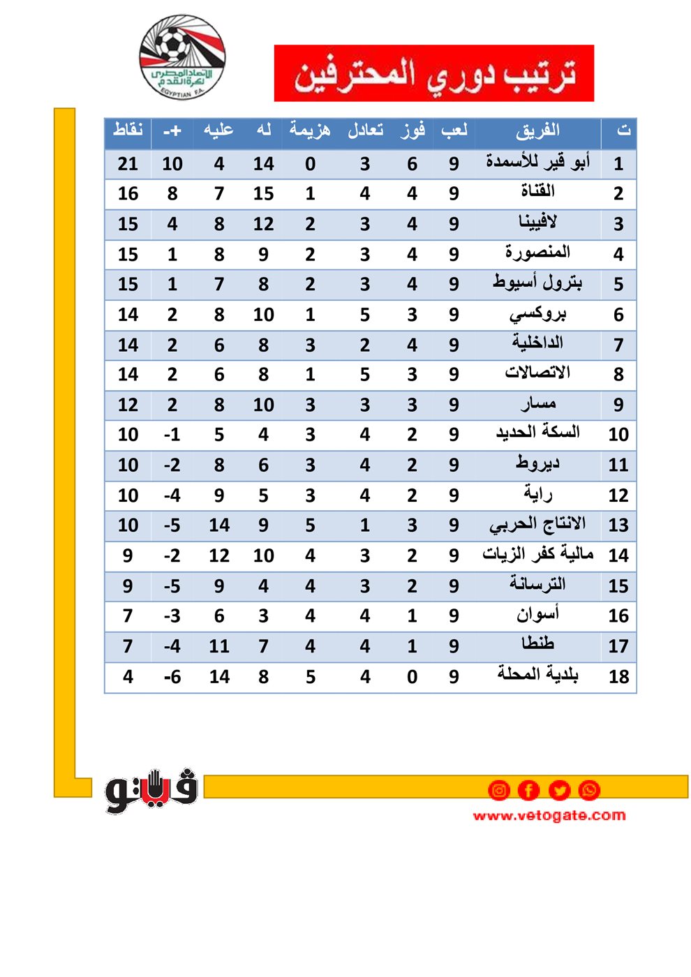 جدول ترتيب دوري المحترفين قبل الجولة العاشرة