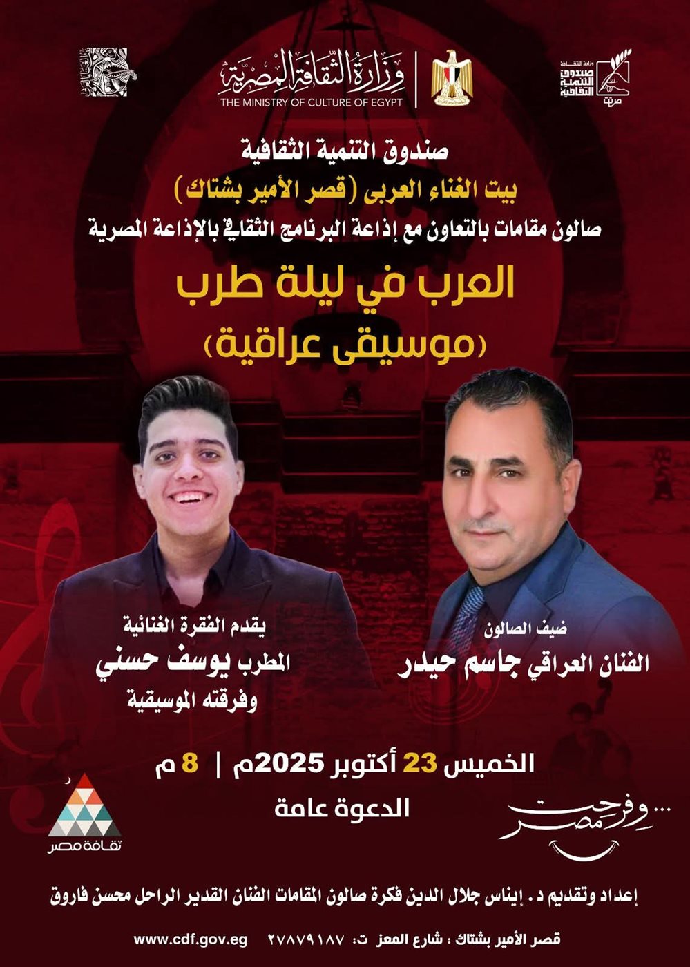 كما يقدم المطرب يوسف حسني وفرقته الموسيقية فقرة غنائية تتنقل بين المقامات العراقية والأنغام العربية الأصيلة، في تواصل فني يجمع بين التراث والتجديد.