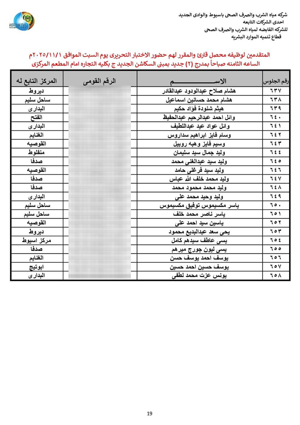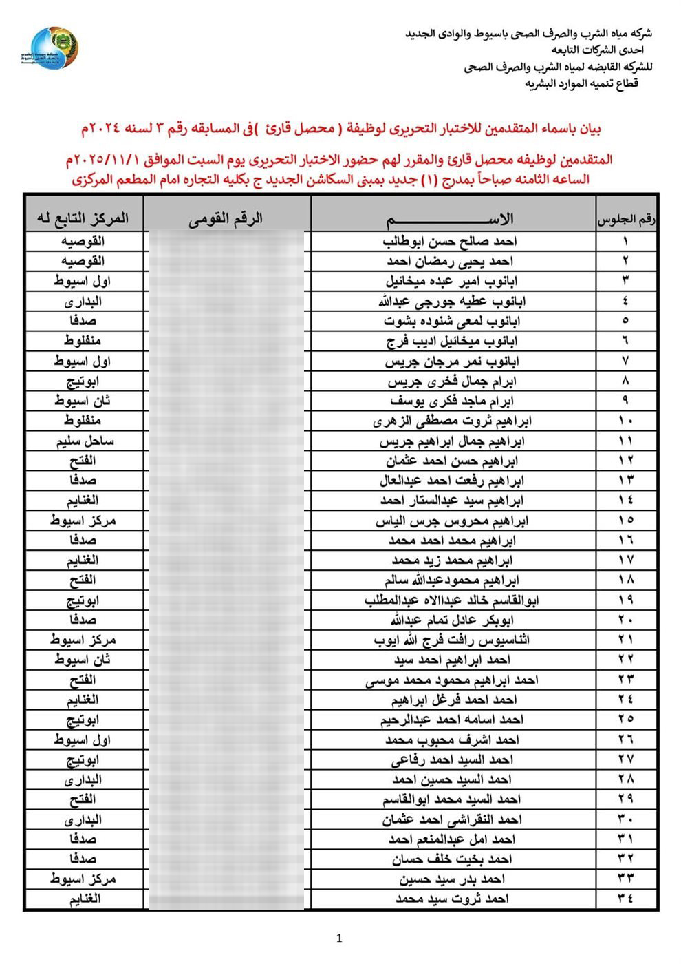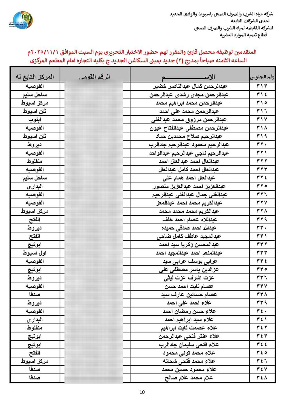 كما صرّح اللواء ياسر حسن ـ رئيس قطاع الموارد البشرية بشركة مياه أسيوط – بأنه تم تحديد موعد الاختبار التحريري يوم السبت الموافق 1 نوفمبر 2025م، في تمام الساعة الثامنة صباحًا، وذلك بمدرجي (1و2) بمبنى السكاشن الجديد ( ج ) بكلية التجارة – جامعة أسيوط، أمام المطعم المركزي، وذلك وفقًا لكشوف الأسماء المُعلنة.