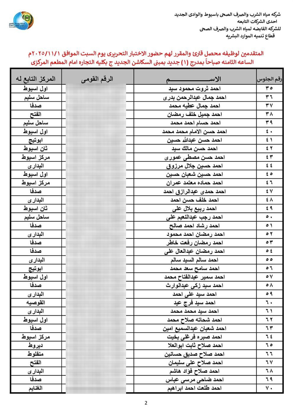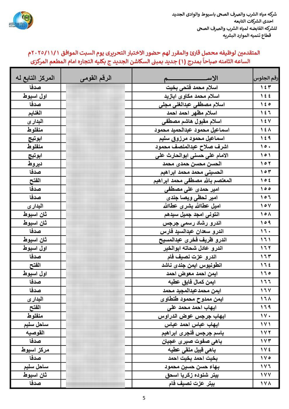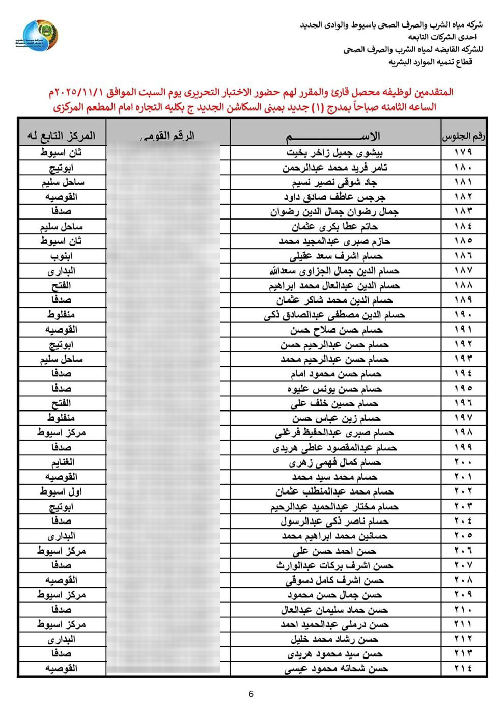 كما صرّح اللواء ياسر حسن ـ رئيس قطاع الموارد البشرية بشركة مياه أسيوط – بأنه تم تحديد موعد الاختبار التحريري يوم السبت الموافق 1 نوفمبر 2025م، في تمام الساعة الثامنة صباحًا، وذلك بمدرجي (1و2) بمبنى السكاشن الجديد ( ج ) بكلية التجارة – جامعة أسيوط، أمام المطعم المركزي، وذلك وفقًا لكشوف الأسماء المُعلنة.
