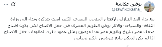 وعن سر اقتراحه بوضح التقويم المصري في حفل الافتتاح، قال توفيق عكاشة: “لكي يكون افتتاح متحف مصر بتاريخ وتقويم مصر هذا موضوع يمثل عمود فقرى لمقومات حفل الافتتاح إذا لم يكن لديكم مانع هولامى ولكم تحياتى”.