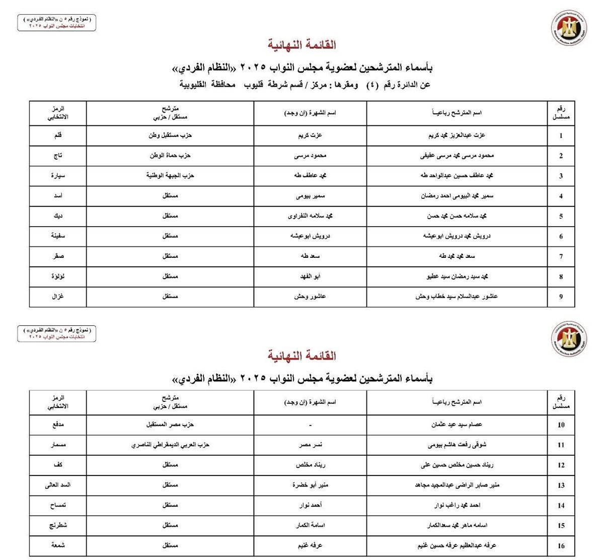 الأسماء النهائية لمرشحي القليوبية في انتخابات مجلس النواب 2025
