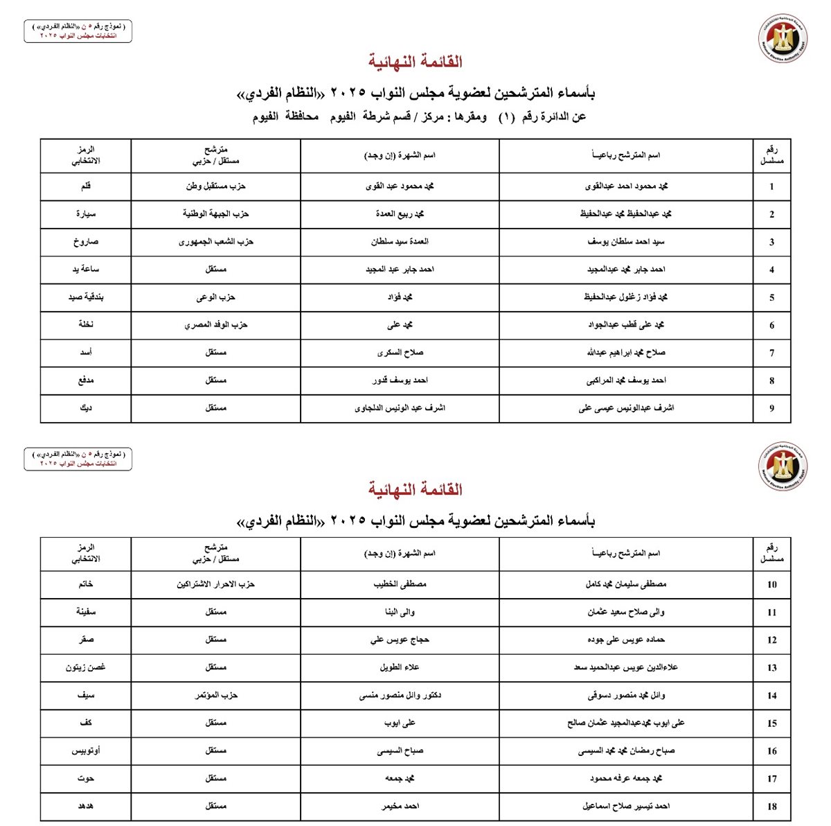 يذكر أن الهيئة الوطنية للانتخابات القوائم النهائية لمرشحي انتخابات مجلس النواب 2025 بمحافظة الفيوم ، عقب انتهاء فترة تلقي الطعون والفصل فيها، استعدادًا لإجراء الانتخابات أوائل شهر نوفمبر المقبل، وضمت كشوف بندر ومركز الفيوم اسم وصفة ورمز المرشح المحبوس.