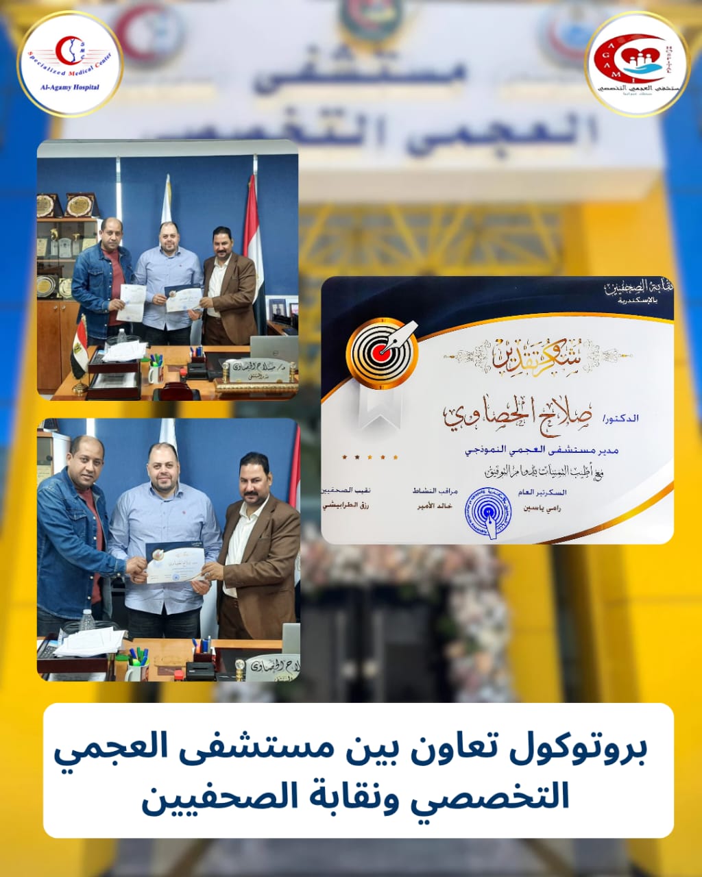 يأتي ذلك في إطار حرص نقابة الصحفيين على تقديم أفضل الخدمات الصحية لأعضائها، وجري تسليم التعاقد والتعاون مشترك بين نقابة الصحفيين ومستشفى العجمي التخصصي بالإسكندرية، بهدف توفير خدمات طبية متميزة للصحفيين وأسرهم.