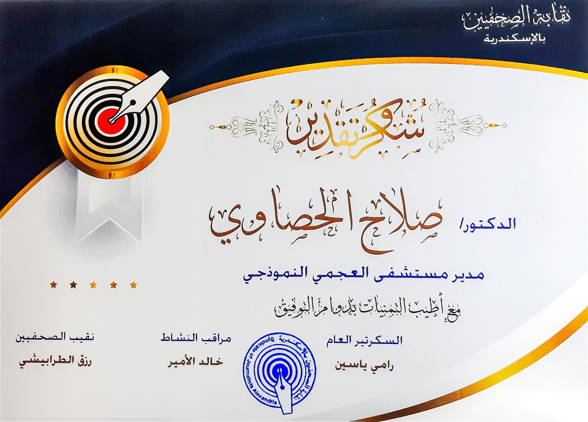 وخلال اللقاء قامت نقابة الصحفيين بتقديم شهاده تقدير للدكتور صلاح الحصاوي مدير المستشفى، تقديرا له علي تقديم الرعاية الصحية المتميزة اللازمه لاعضاء النقابة، وعلي خدمه المواطنين والدور الإنساني الذي يقوم به في رعاية المرضي.