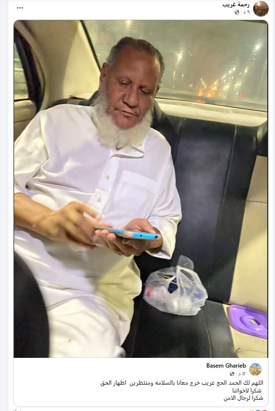 وقال باسم غريب ابن المسن على صفحته بـ"فيس بوك": "اللهم لك الحمد الحج غريب خرج معانا بالسلامة ومنتظرين إظهار الحق شكرا لإخواتنا شكرا لرجال الأمن".