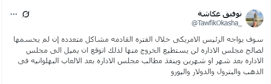 وأوضح توفيق عكاشة أن الرئيس الأمريكي ترامب لن يستطيع الخروج عن قرارات مجلس الإدارة، وسيحسم أمره لصالح المجلس، متوقعًا أن يميل ترامب لقرارات المجلس خلال شهر أو شهرين، وينفذ مطالبهم في الذهب والبترول والدولار واليورو.