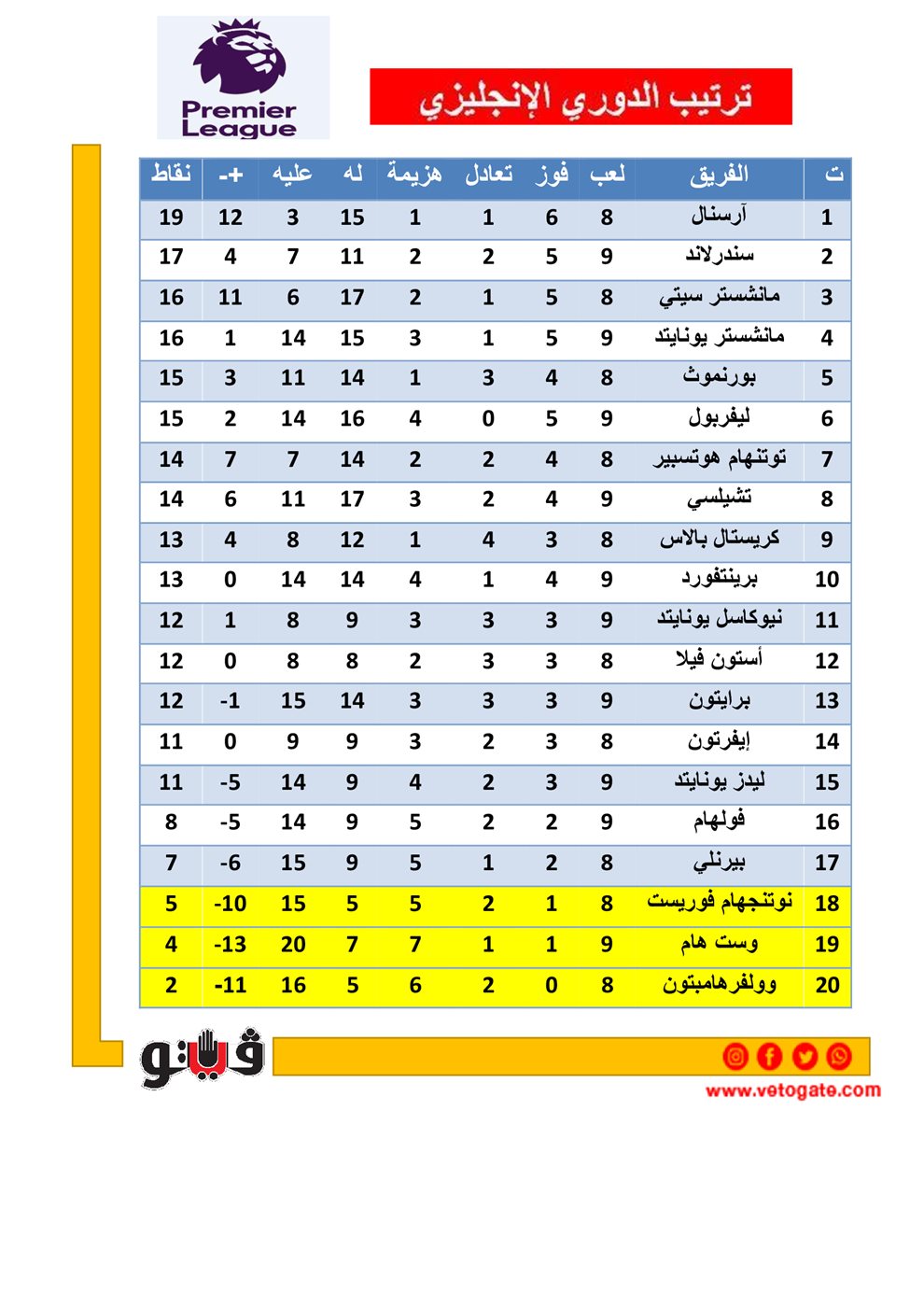 ترتيب الدوري الإنجليزي قبل ختام الجولة التاسعة