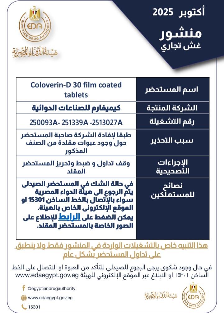 أعلنت هيئة الدواء المصرية في منشور تحذيري خلال أكتوبر 2025 عن ضبط تداول عبوات مقلدة من مستحضر Coloverin-D أقراص مغلفة، وذلك للتشغيلات أرقام 250093A - 251339A - 2513027A.