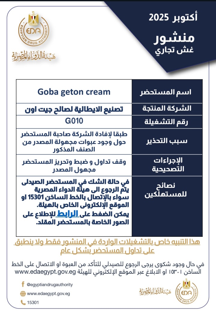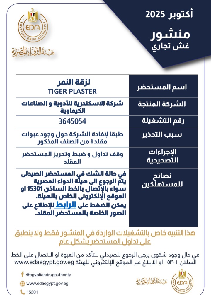 جاء هذا الإجراء بعد ورود إفادة من الشركة المنتجة بوجود عبوات مقلدة من المستحضر المتداول في الأسواق.