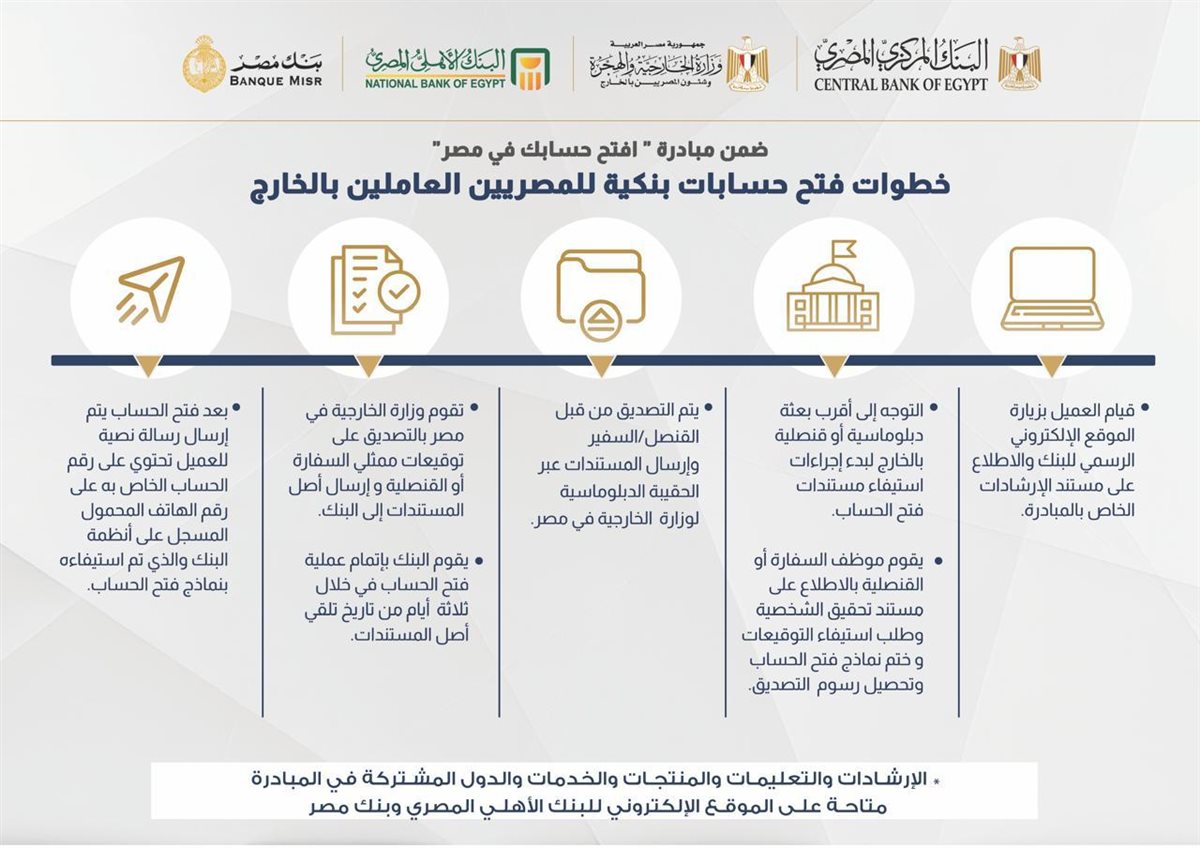 وتماشيًا مع رؤية الدولة المصرية لتلبية احتياجات المصريين العاملين بالخارج وتيسير كافة الخدمات المقدمة لهم، أطلق البنك المركزي المصري، ووزارة الخارجية والهجرة وشئون المصريين بالخارج، مبادرة "افتح حسابك في مصر" بالتعاون مع البنك الأهلي المصري وبنك مصر.