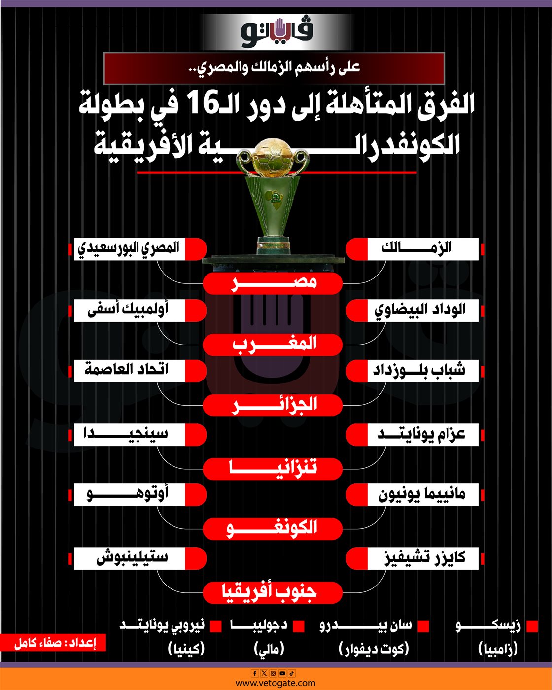 على رأسهم الزمالك والمصري.. الفرق المتأهلة إلى دور الـ16 في بطولة الكونفدرالية الأفريقية (انفوجراف)