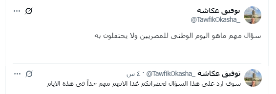 رسالة غامضة للمصريين، وجه الإعلامي توفيق عكاشة رسالة غامضة، وصفها بـ "المهمة" للمصريين، سألهم فيها عن العيد الوطني المهم للمصريين، لكنهم لا يحتفلون به.