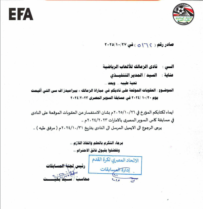 أرسلت اليوم إدارة المسابقات بالاتحاد المصري لكرة القدم خطابا لنادي الزمالك للألعاب الرياضية ردا على استفساره المرسل أمس إلى الاتحاد حول العقوبات الموقعة على النادي في بطولة كأس السوبر المصري الذي أقيم بالإمارات عن موسم ٢٠٢٤/٢٣.