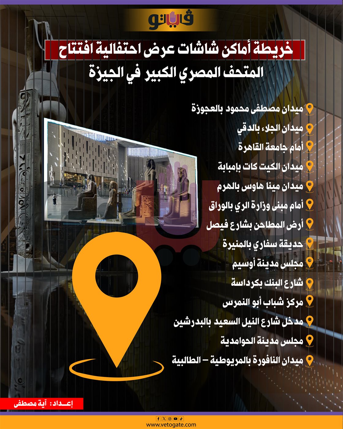 خريطة أماكن شاشات عرض احتفالية افتتاح المتحف المصري الكبير في الجيزة (إنفوجراف)