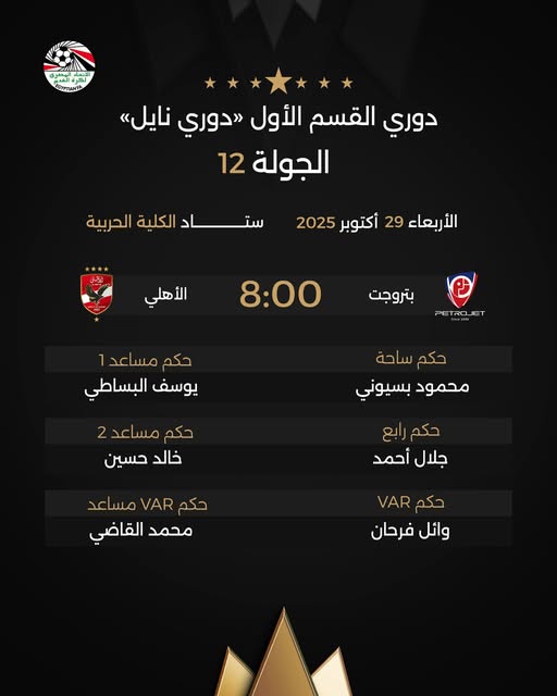 الدوري المصري، أعلنت لجنة الحكام بالاتحاد المصري لكرة القدم عن طاقم التحكيم التي سوف يدير مباراة النادي الأهلي ضد بتروجيت في الجولة الثانية عشرة من بطولة الدوري المصري الممتاز.