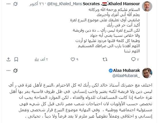 وقال علاء مبارك، عبر منصة "أكس"، في رأيه للتبرع لأهل غزة: "التبرع لأهل غزة في رأيي ليس دينا ولا فريضة، لكنه يُعتبر واجبا إنسانيا في ظل ظروف قاسية يمر بها أهل غزة، خاصة إذا كانت المساعدات للدواء والغذاء".