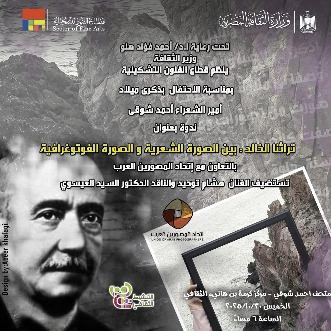 أعلن قطاع الفنون التشكيلية، برئاسة الدكتور وليد قانوش، عن تنظيم ندوة ثقافية وفنية كبرى بعنوان "تراثنا الخالد: بين الصورة الشعرية والصورة الفوتوغرافية"، وذلك احتفالا بذكرى ميلاد أمير الشعراء أحمد شوقي.