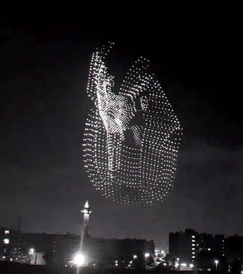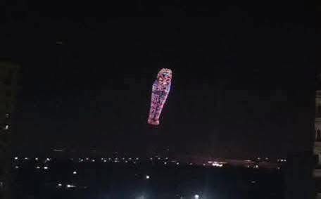 وظهر في السماء في الساعات الأولى من صباح اليوم الخميس، مجسمات لقناع توت عنخ آمون وعدد من القطع الأثرية التي سيضمها المتحف المصري الكبير، المقرر افتتاحه في حفل مهيب مساء السبت المقبل 1 نوفمبر.