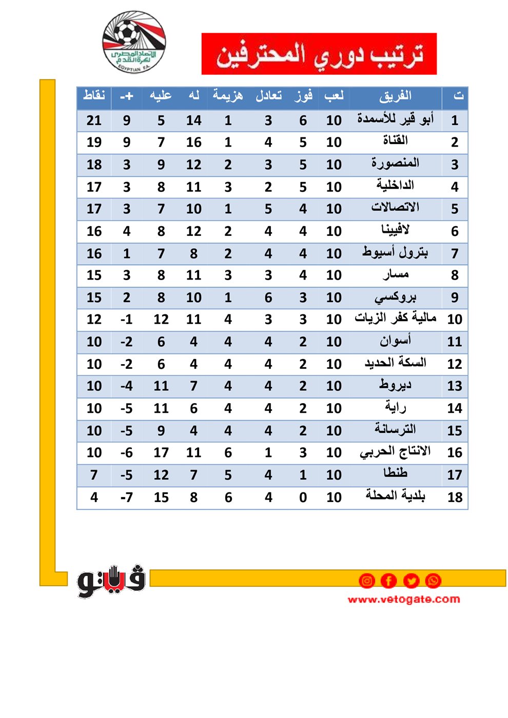 ترتيب دوري المحترفين، يتصدر أبو قير للأسمدة قمة جدول ترتيب دوري المحترفين قبل منافسات الجولة الـ 11 المقرر لها اليوم الخميس وغدا الجمعة.