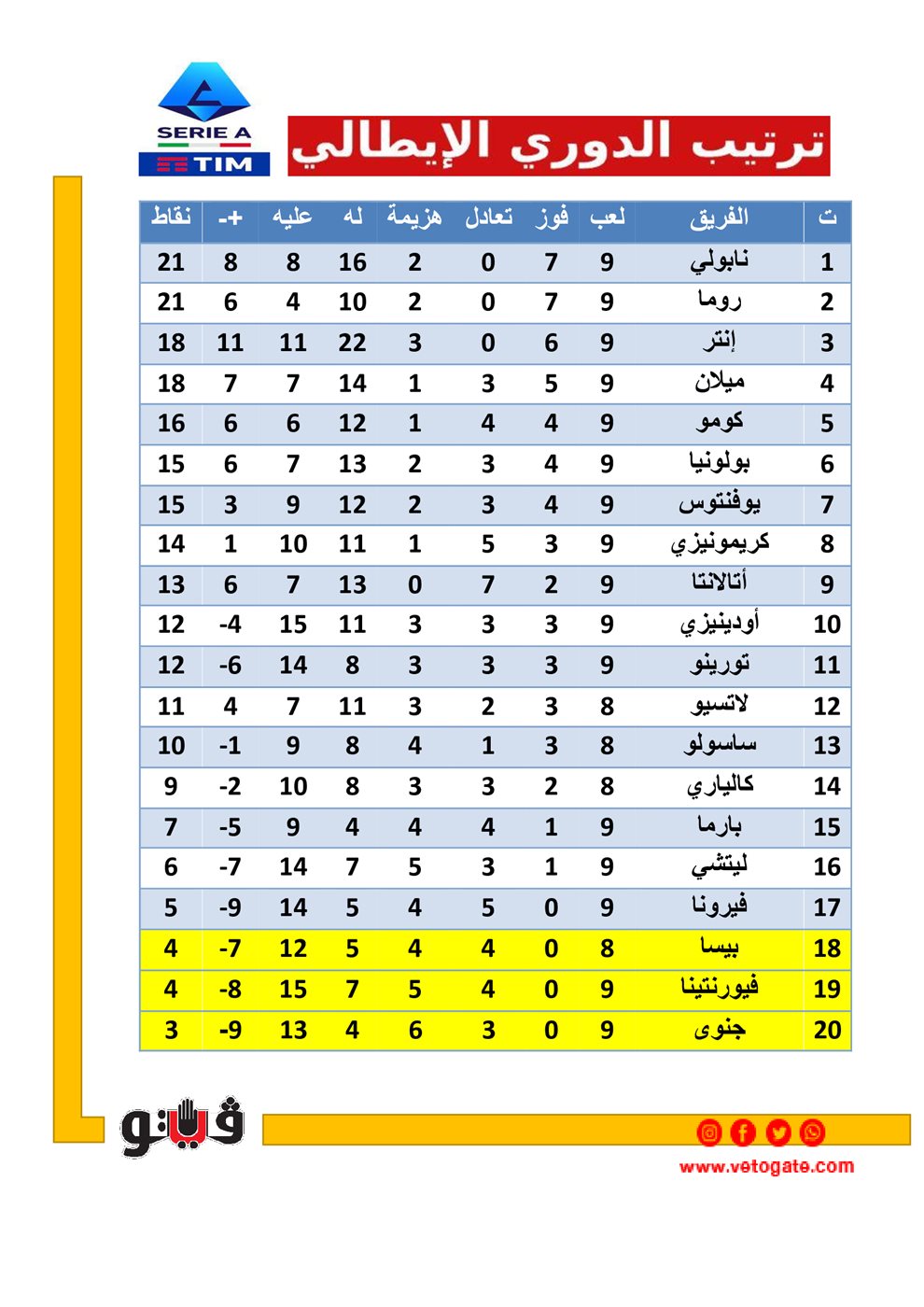 ترتيب الدوري الإيطالي قبل ختام الجولة التاسعة