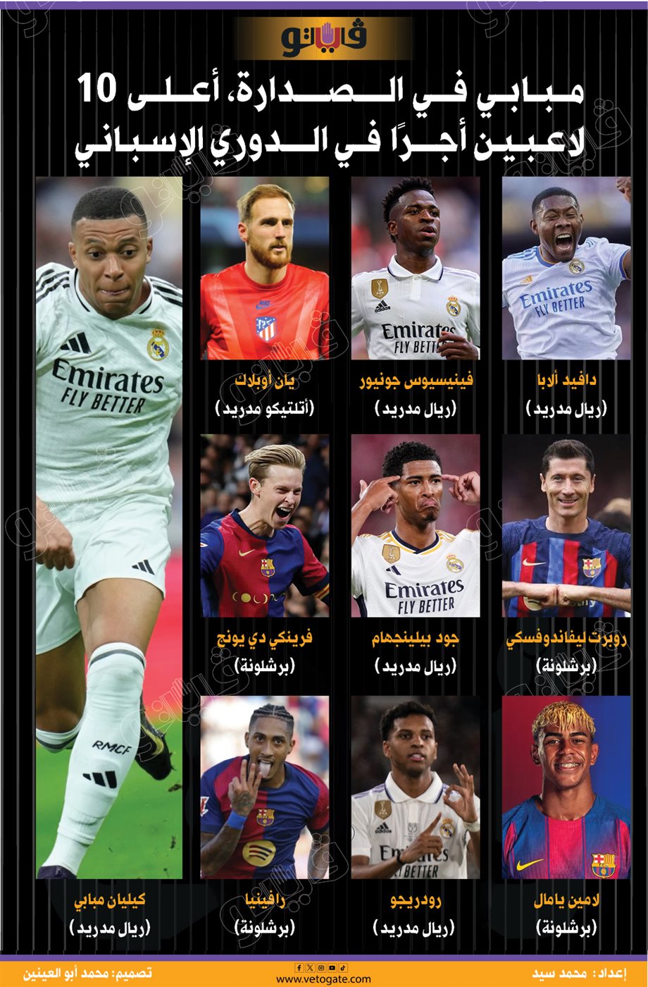 مبابي في الصدارة، أعلى 10 لاعبين أجرًا في الدوري الإسباني (إنفوجراف)