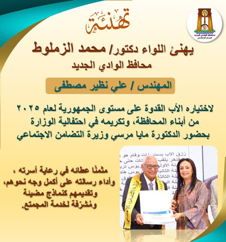 ومن جانبه قدم اللواء دكتور محمد الزملوط محافظ الوادي الجديد، التهنئة لفوز علي نظير بلقب الأب القدوة من محافظة الوادي الجديد، وتكريمه من قبل مايا مرسي وزيرة التضامن.