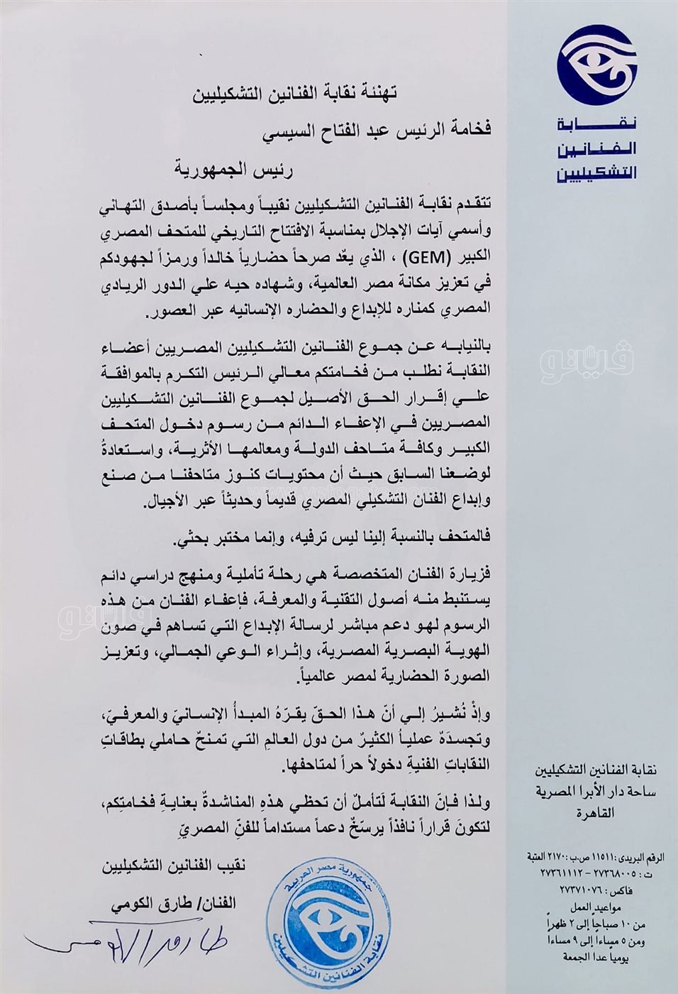 وطالبت النقابة باسم جموع الفنانين التشكيليين المصريين الأعضاء رئيس الجمهورية عبد الفتاح السيسي بـ "الموافقة على إقرار الحق الأصيل لجموع الفنانين التشكيليين المصريين في الإعفاء الدائم من رسوم دخول المتحف الكبير وكافة متاحف الدولة ومعالمها الأثرية".