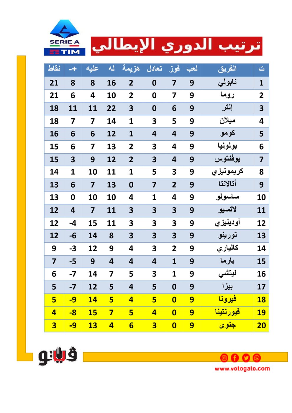 جدول ترتيب فرق الدوري الإيطالي بعد الجولة التاسعة