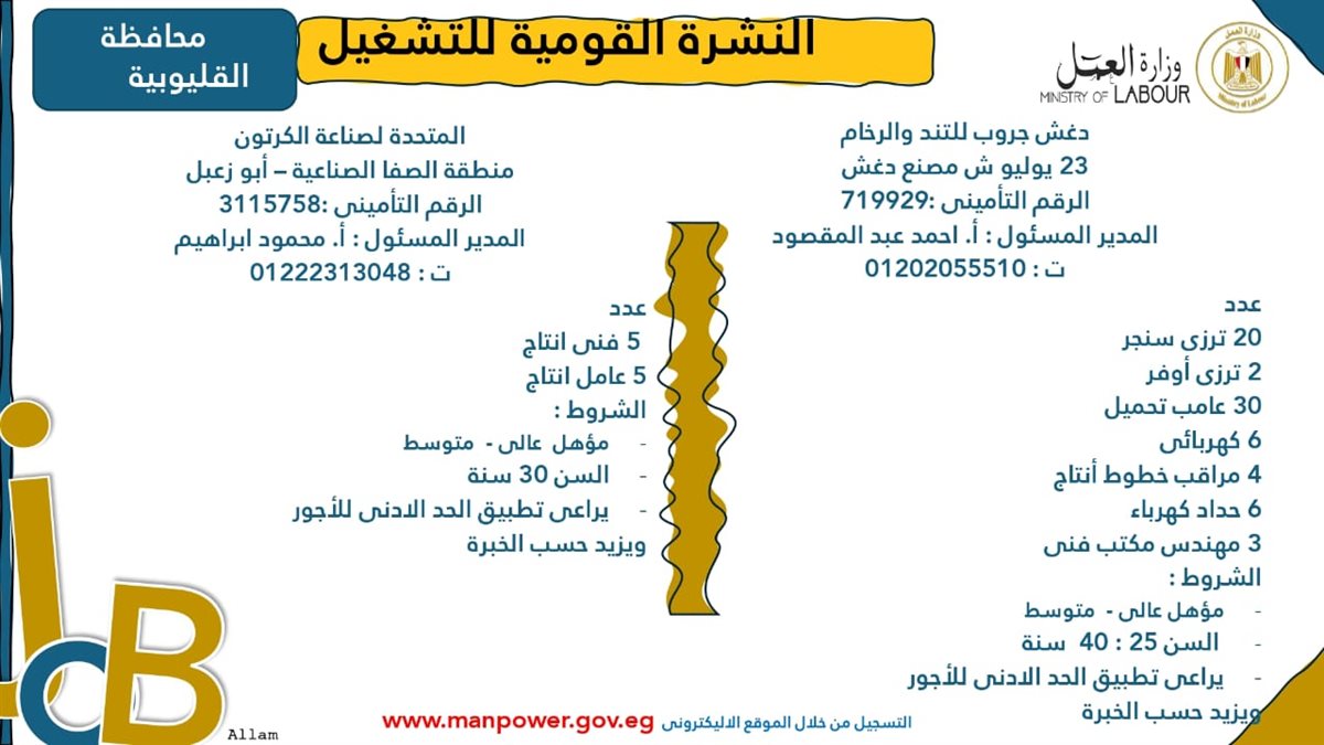 وبيّنت الوزارة أن التقديم على هذه الفرص الجديدة يتم خلال شهر نوفمبر 2025، من خلال الإدارة العامة للتشغيل بمقر الوزارة القديم بمدينة نصر، أو عبر مديريات العمل في المحافظات، كما يمكن التقديم مباشرةً من خلال بيانات الشركات المرفقة بالنشرة، أو عبر الموقع الرسمي لوزارة العمل على شبكة الإنترنت.
