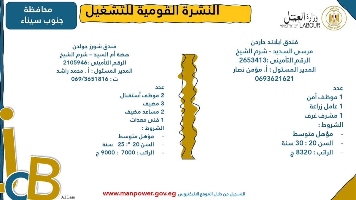 وأوضحت الوزارة في بيانها أن 107 شركات من القطاع الخاص في 16 محافظة قد أبدت استعدادها لتوفير 6721 فرصة عمل جديدة في عدد من التخصصات والمهن المختلفة، منها فرص مخصصة لأصحاب القدرات الخاصة (ذوي الهمم)، برواتب مجزية تُحدد وفقًا لطبيعة المقابلة الشخصية، مع الالتزام الكامل بتطبيق الحد الأدنى للأجور، فضلًا عن الاستفادة من منظومة التأمين الصحي والاجتماعي.