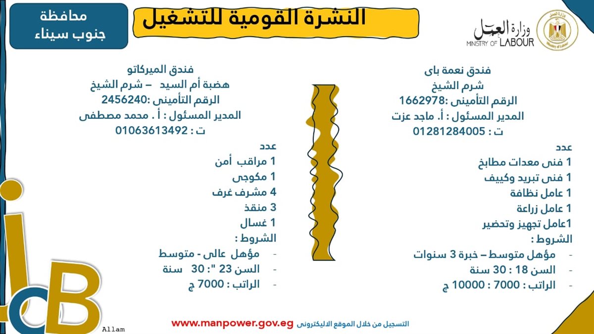 أصدرت وزارة العمل اليوم الجمعة، نشرة التوظيف نصف الشهرية التي تتضمن فرص عمل جديدة متاحة في مختلف المحافظات، بالتعاون مع شركات القطاع الخاص، وذلك في إطار جهود الدولة المستمرة لتوفير فرص عمل لائقة للشباب، وتنفيذًا لتوجيهات القيادة السياسية بدمج مختلف فئات المجتمع في سوق العمل، وعلى رأسهم ذوو الهمم.