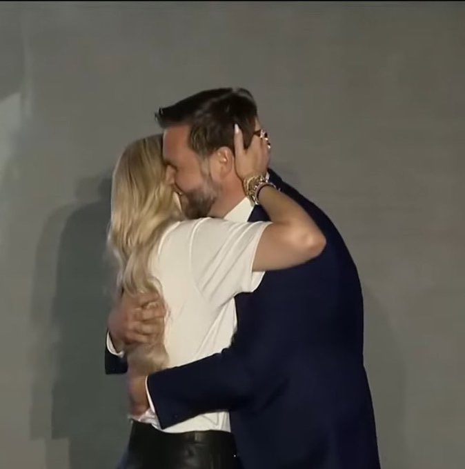وعندما صعد فانس إلى المنصة تعانق هو وإريكا بدفء، وضع نائب الرئيس يديه على خصر إريكا، وبدت وكأنها تمرر أصابعها بين خصلات شعره، مما جعله أشعثا بعض الشيء.