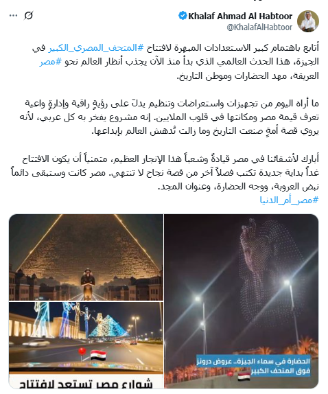 قال الملياردير الإماراتي خلف الحبتور: "أتابع باهتمام كبير الاستعدادات المبهرة لافتتاح المتحف المصري الكبير في الجيزة، هذا الحدث العالمي الذي بدأ منذ الآن يجذب أنظار العالم نحو مصر العريقة، مهد الحضارات وموطن التاريخ. ما أراه اليوم من تجهيزات واستعراضات وتنظيم يدلّ على رؤيةٍ راقية وإدارةٍ واعية تعرف قيمة مصر ومكانتها في قلوب الملايين. إنه مشروع يفخر به كل عربي، لأنه يروي قصة أمةٍ صنعت التاريخ وما زالت تُدهش العالم بإبداعها".
