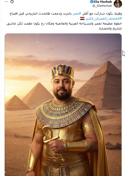 الإعلامي اللبناني إيلي مرعب مرتديًا زي القدماء المصريين قائلًا: " وهيك بكون شاركت مع أهل مصر بالترند ودعمت هالحدث التاريخي قبل افتتاح المتحف المصري الكبير خطوة عظيمة لمصر وللسياحة العربية والعالمية ومكان رح يكون مقصد لكل عاشق للتاريخ والحضارة"