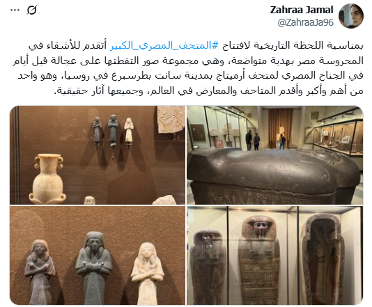 وقالت المؤثرة العراقية زهراء جمال: " بمناسبة اللحظة التاريخية لافتتاح المتحف المصري الكبير أتقدم للأشقاء في المحروسة مصر بهدية متواضعة، وهي مجموعة صور التقطتها على عجالة قبل أيام في الجناح المصري لمتحف أرميتاج بمدينة سانت بطرسبرغ في روسيا، وهو واحد من أهم وأكبر وأقدم المتاحف والمعارض في العالم، وجميعها آثار حقيقية".