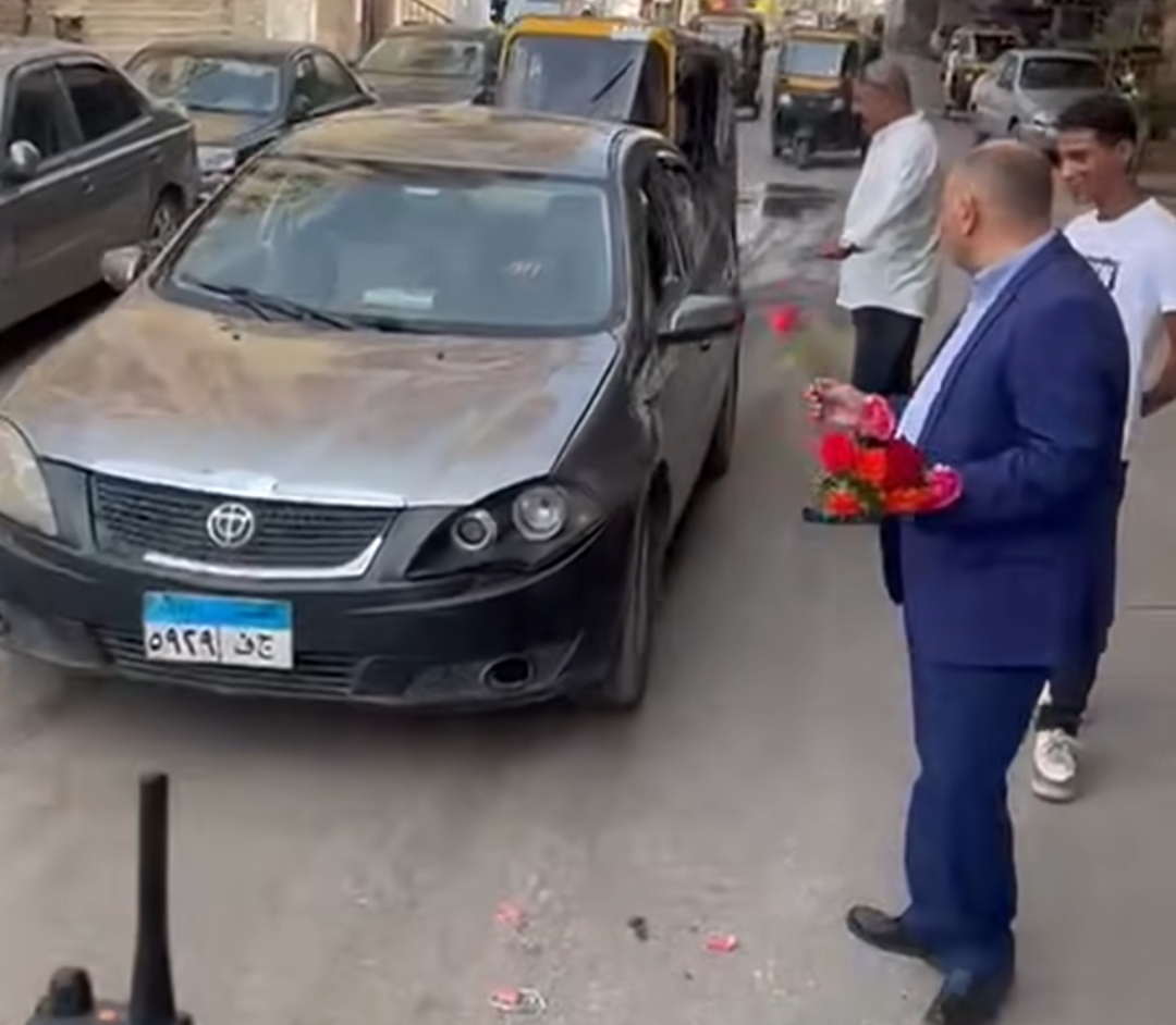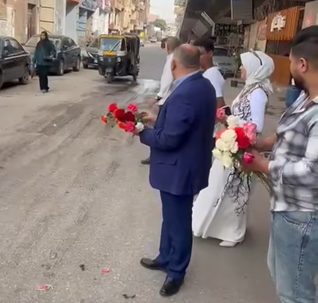 رئيس مدينة الحوامدية يوزع الورود على المواطنين احتفالًا بافتتاح المتحف الكبير (صور)