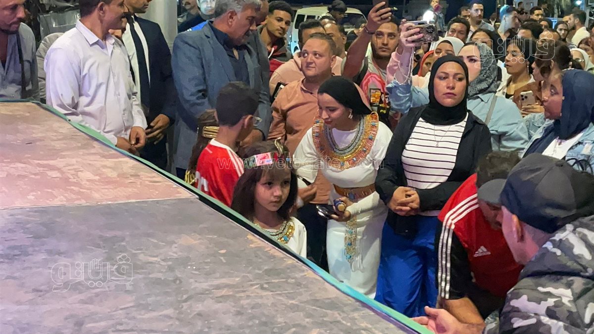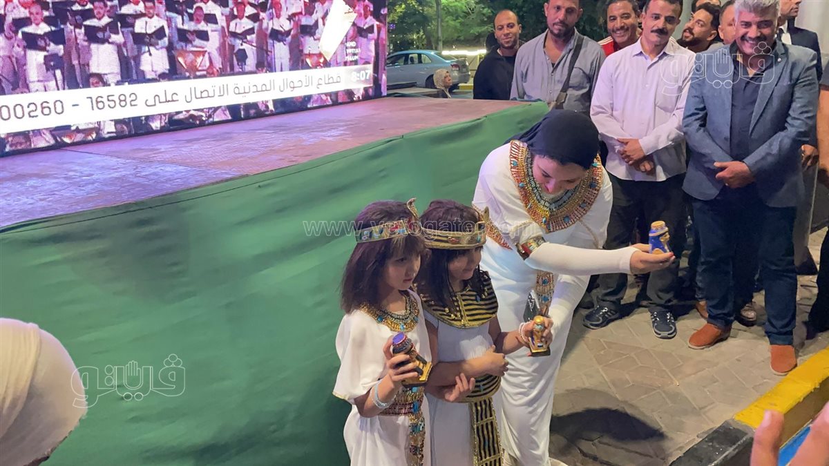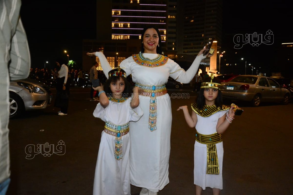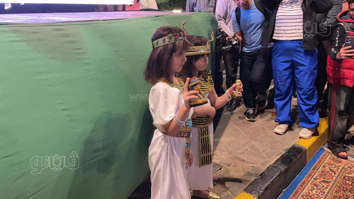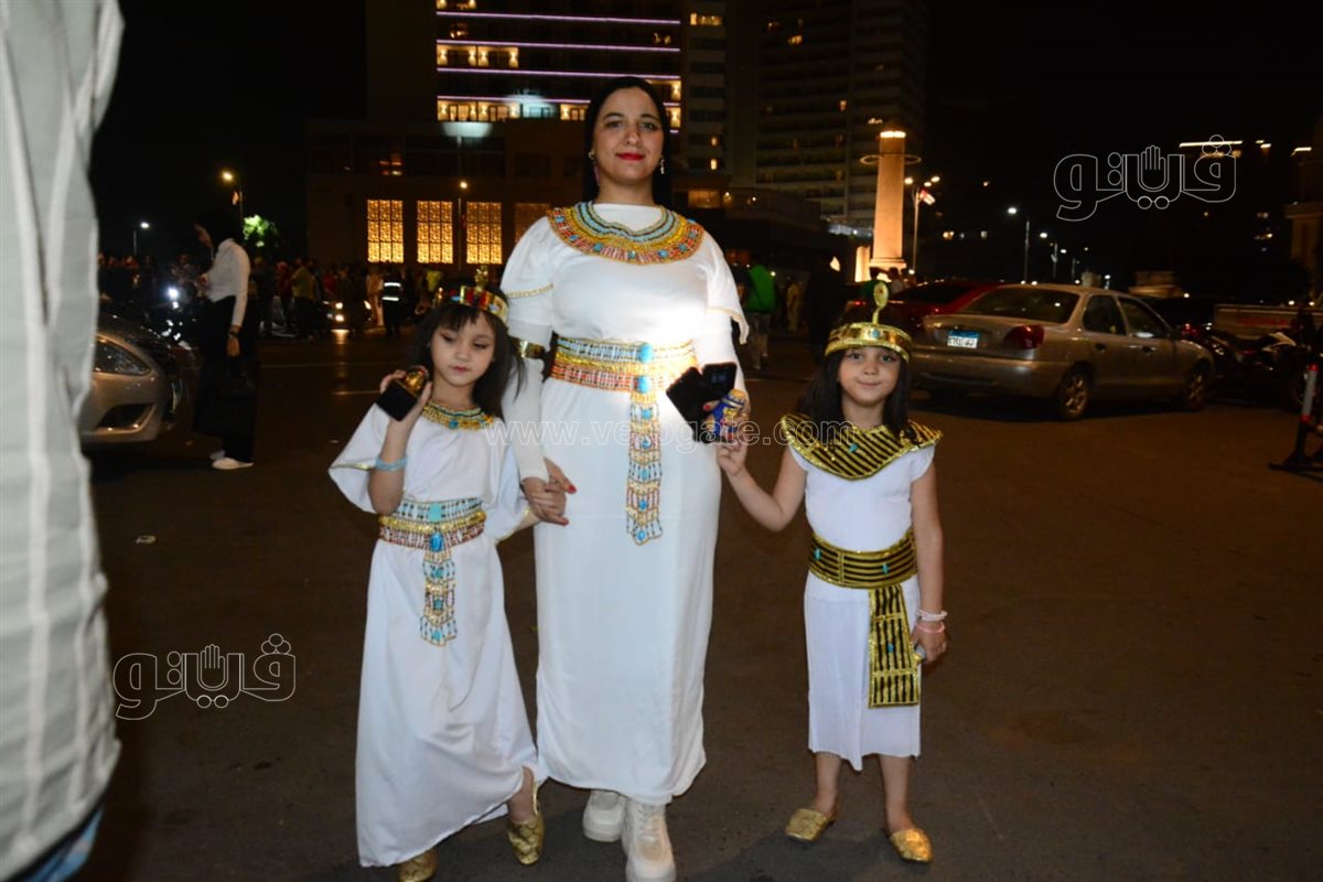 مهندسة وطفلاها بالزي الفرعوني يخطفون الأنظار أمام شاشات عرض الاحتفال بافتتاح المتحف الكبير (فيديو وصور)