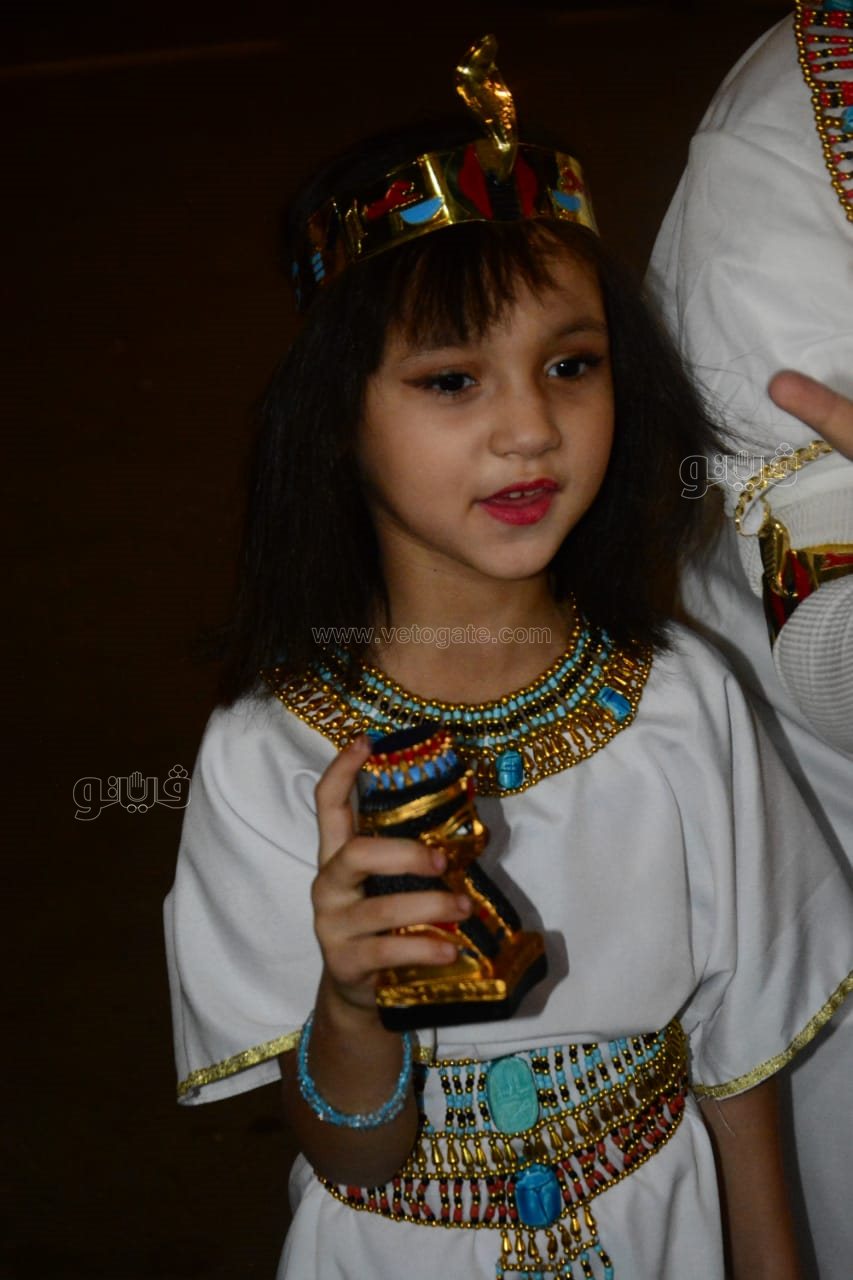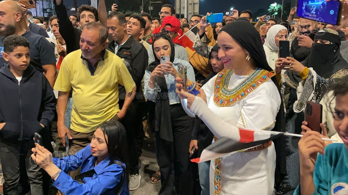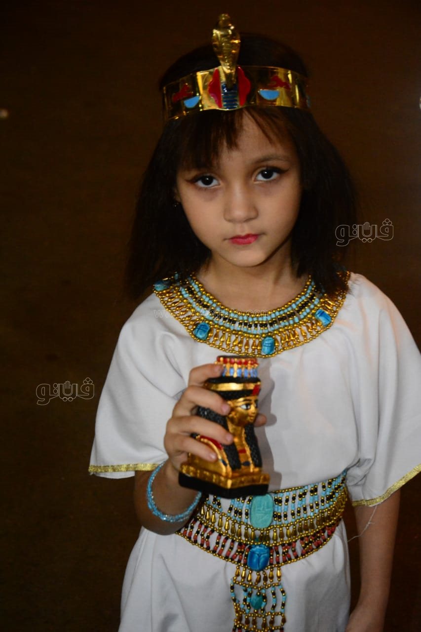 وحرصت على التقاط الصور التذكارية لها ولطفليها، مرتدية الزي الفرعوني، أمام الشاشة العملاقة التي تنقل حفل افتتاح المتحف المصري الكبير.