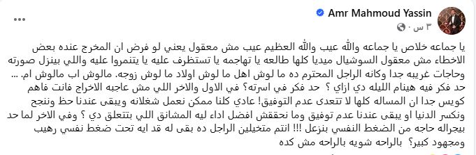 واختتم المؤلف عمرو محمود ياسين منشوره قائلا: "الراجل ده بقاله قد إيه تحت ضغط نفسي رهيب ومجهود كبير؟ بالراحة شوية بالراحة مش كده".