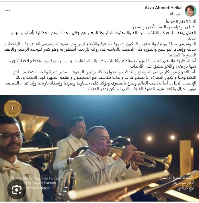 انتقدت الدكتورة عزة أحمد هيكل، عميدة كلية اللغة والإعلام بالأكاديمية البحرية سابقا، وابنة الدكتور أحمد هيكل وزير الثقافة الأسبق، حفل افتتاح المتحف المصري الكبير.