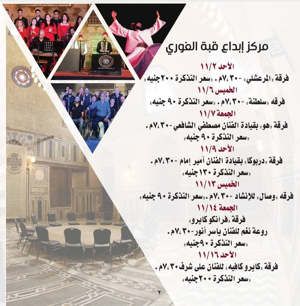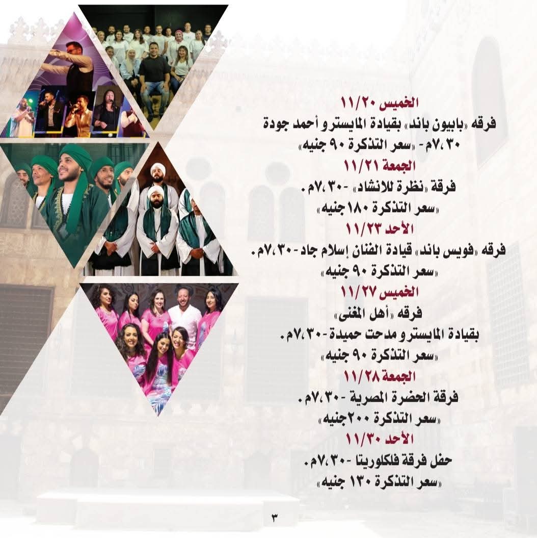 بينما تطل فرقة الحضرة المصرية يوم الجمعة الموافق 28 نوفمبر في تماما الساعة الـ 7:30 مساءً وبسعر 200 جنيه للتذكرة.