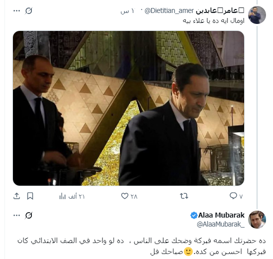 وكان عمر نجل علاء مبارك قد علق على الصورة المنتشرة لوالده علاء وشقيقه جمال في حفل افتتاح المتحف المصري الكبير، فقال: “يعني أبويا في الافتتاح؟ طب اللي قاعد جنبي بيقولي أعمله كوباية شاي ده مين؟”.