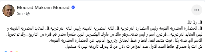 وقال الفنان مراد مكرم، في رسالته التي وجهها للمصريين: "قل ولا تقل، قل الحضارة المصريه القديمة وليست الحضارة الفرعونية، قل اللغة المصرية القديمة، وليس اللغة الفرعونية، قل المعابد المصرية القديمة وليست المعابد الفرعونية.…..".