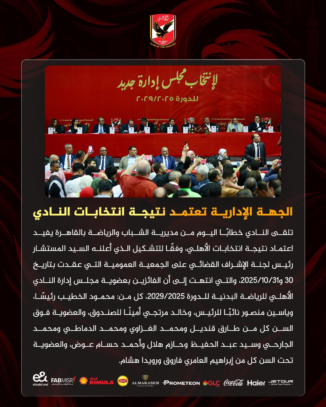 تلقى النادي الأهلي خطابًا اليوم من مديرية الشباب والرياضة بالقاهرة يفيد اعتماد نتيجة انتخابات الأهلي، وفقًا للتشكيل الذي أعلنه المستشار رئيس لجنة الإشراف القضائي على الجمعية العمومية التي عقدت بتاريخ 30 و31/ 10/ 2026.