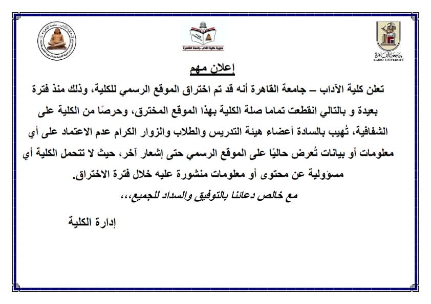 وأكدت كلية الآداب بجامعة القاهرة، أن صلتها انقطعت تماما بالموقع الإلكتروني منذ فترة بعيدة، مشيرة إلى أنها لا تتحمل أي مسئولية عن محتوى أو معلومات منشورة عليه خلال فترة الاختراق.