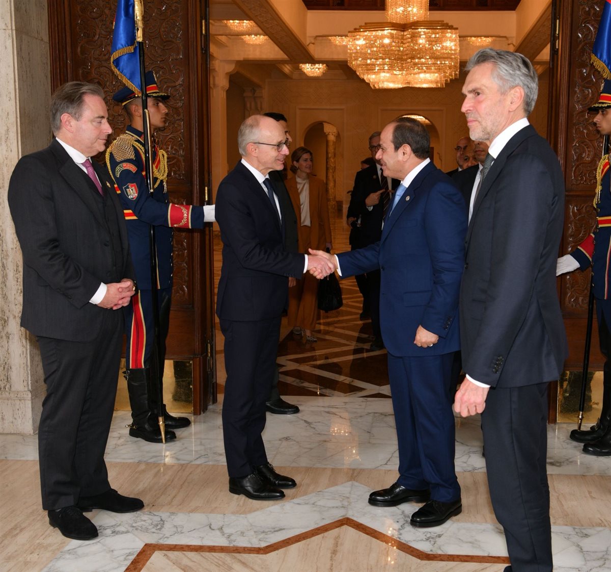 استقبل الرئيس عبد الفتاح السيسي، اليوم الأحد، كلًا من لوك فريدن رئيس وزراء دوقية لوكسمبورج، وديك سخوف رئيس وزراء مملكة هولندا، وبارت دي فيفر رئيس وزراء مملكة بلجيكا، وذلك بحضور الدكتور بدر عبد العاطي وزير الخارجية والهجرة وشئون المصريين في الخارج، ومن جانب لوكسمبورج كريستيان مولر سفير دوقية لوكسمبورج في القاهرة، ومن الجانب الهولندي بيتر موليما سفير مملكة هولندا بالقاهرة، وهيلين ستيرجيو مستشار الشئون الخارجية ومنسق الدفاع، ومن الجانب البلجيكي جيرون بيتورز، مسئول الشئون السياسية بسفارة مملكة بلجيكا بالقاهرة.