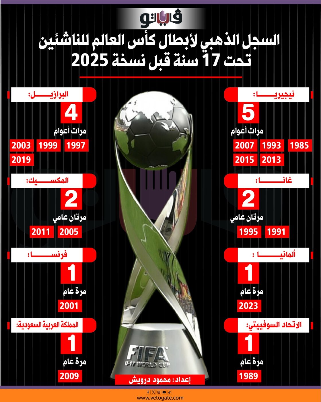 السجل الذهبي لأبطال كأس العالم للناشئين تحت 17 سنة قبل نسخة 2025 (انفوجراف)