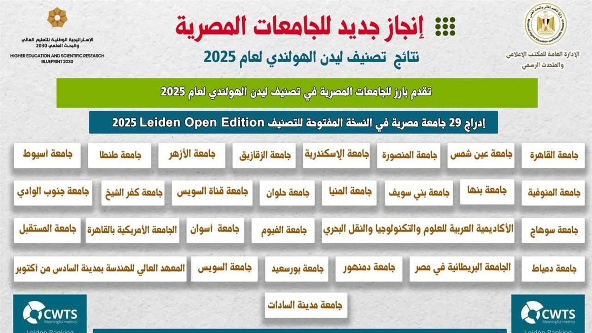 أعلن الدكتور أحمد المنشاوي، رئيس جامعة أسيوط، عن تقدم الجامعة في مؤشر التأثير العلمي ضمن التصنيف الهولندي المرموق ليدن “CWTS Leiden University” بنسختيه التقليدية والمفتوحة لعام 2025.
